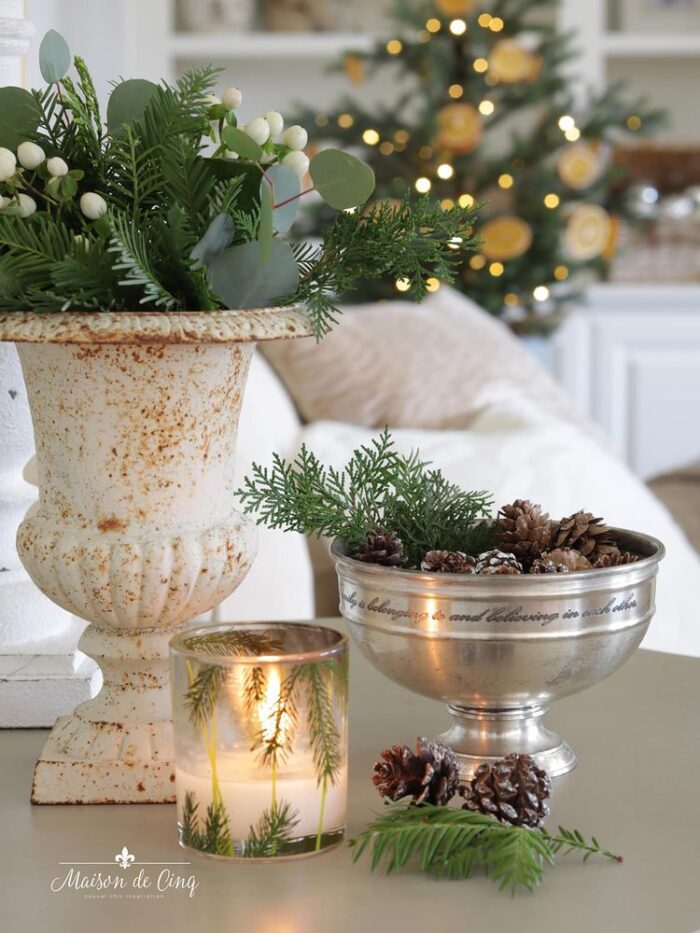 Fill vintage vessels like silver bowls, brass pitchers or wooden troughs with natural decor like mixed evergreens and pinecones for a simple French farmhouse feel. A scented pine candle adds a pleasing scent that subliminally underscores the look.