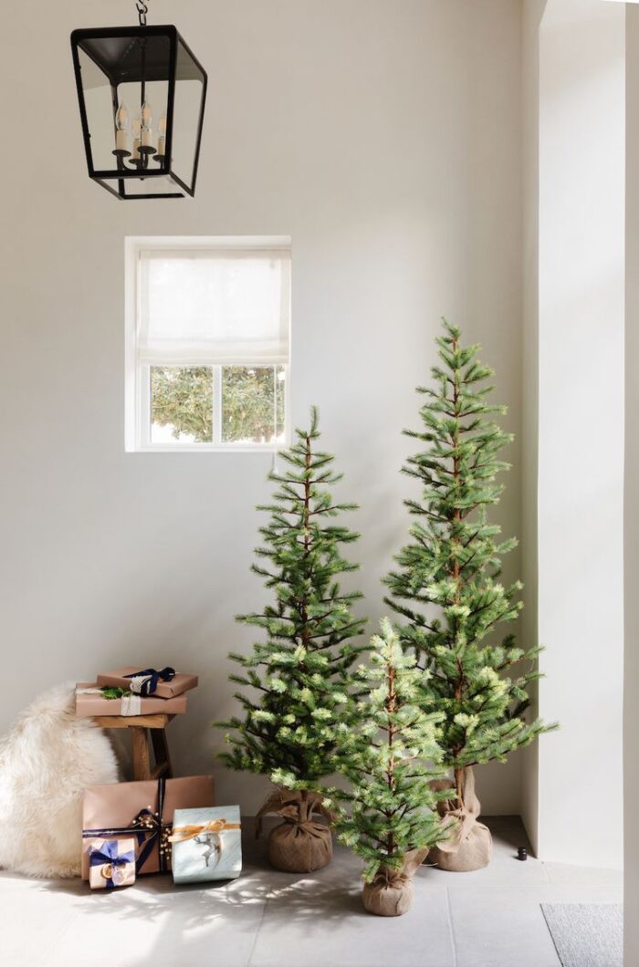 And, The Spruce has a few appealing ideas for bringing an empty hallway or lonely corner to seasonal life with a trio of mini trees wrapped in burlap at the base. A few wrapped packages can create a sense of eye-pleasing anticipation, and it’s not even necessary to drape the trees in ornaments or lights. If you wanted more, you could wrap ribbons around the base of each tree and gussy things up, a tiny bit more.